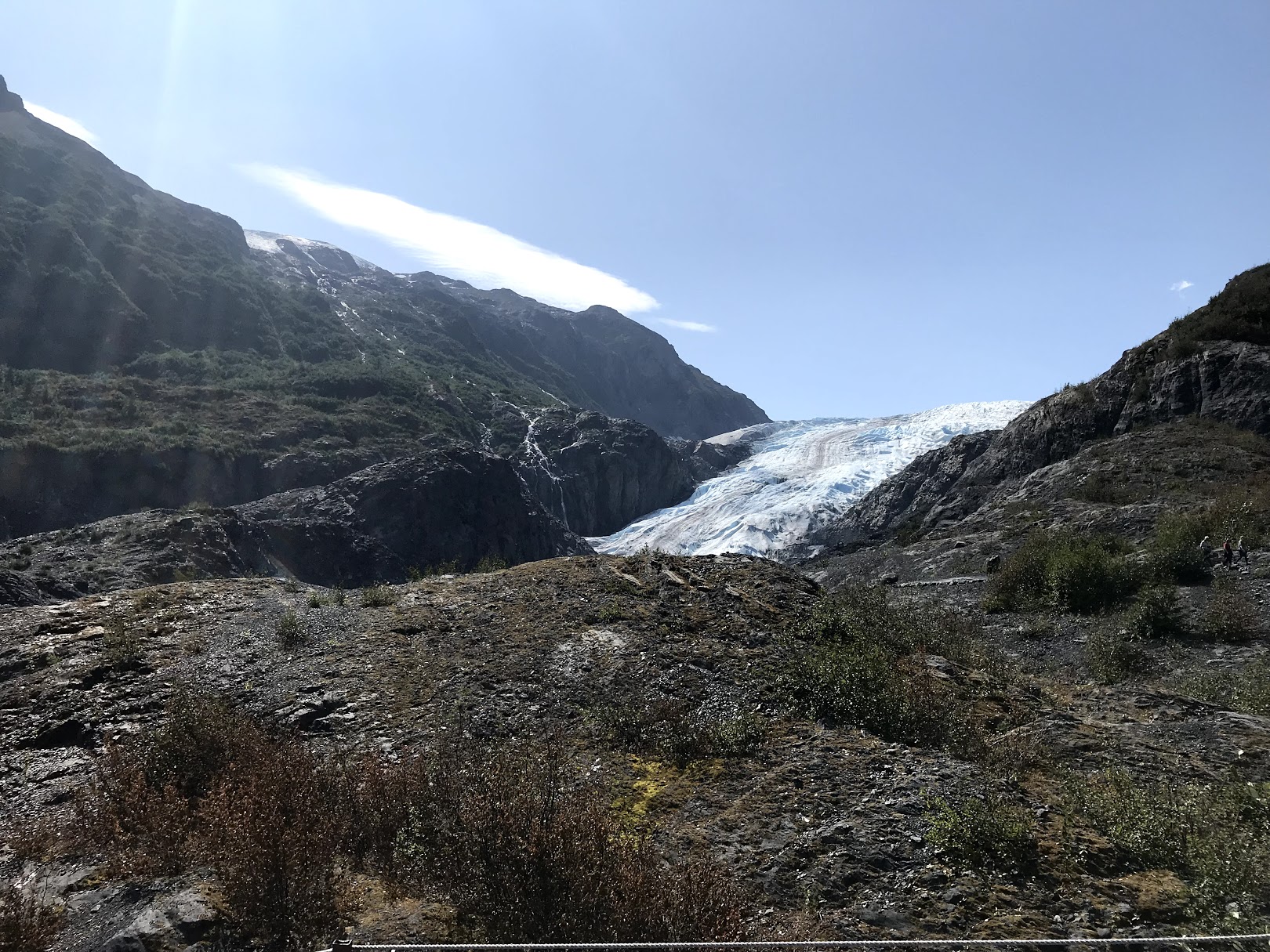Since the boat tour took place in the morning, we spent the remainder of our day traveling to Kenai Fjords National Park.  The visitor center is in Seward, but the entrance to the park was about a 15-20 minute drive outside of the town.  We parked our car to hop out and hike to Exit Glacier.  We walked on a paved road for about ¾ of a mile to the Exit Glacier Overlook.  This was a very easy hike, great view of the landscape and glacier.  However, the overlook did not get you close to the glacier.  We then hiked an additional .8 mile to “Exit Glacier Washout.”  This was not a paved path, but very easy to walk.  This path got you very close to the glacier.  It was an absolutely magnificent view.  On our way back, we noticed signs along the path with years on them.  We realized that the signs represented how far the glacier stretched at that point in time.  It was fascinating.  What an impactful way to show how the climate is changing and affecting landmarks, such as the glaciers.